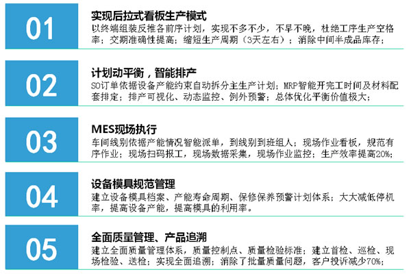 1、系统部署:订单评审、BOM工艺、质量体系、APS有限产能智能排产、MES现场执行、供应链管理、成本预测及管理、财务及费用管理;