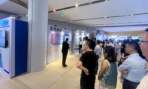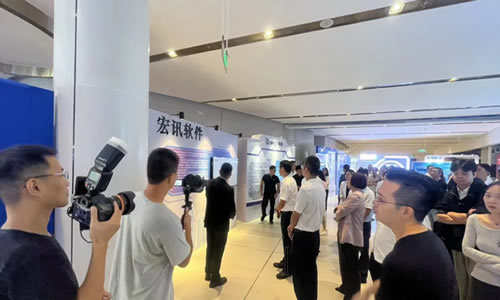 众多企业客户及专业人士来到宏讯软件展位,听取宏讯工程师介绍。